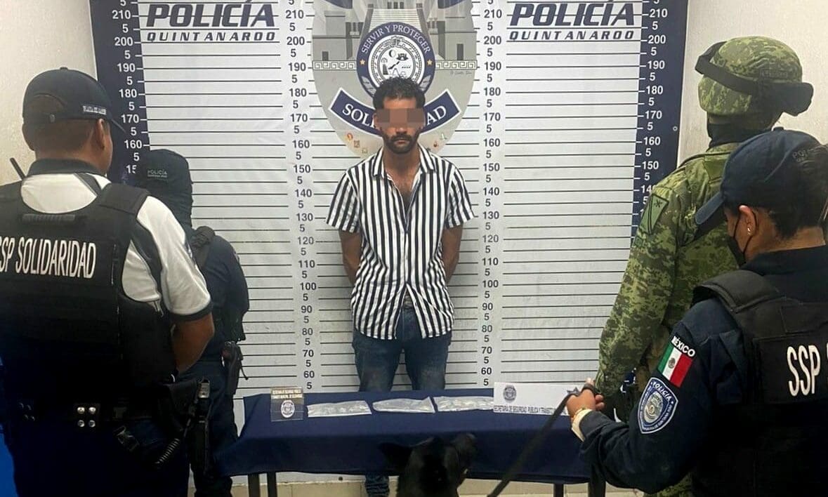 Luis “N” de 30 años de edad, originario de Aguascalientes, fue asegurado la madrugada de hoy 6 de agosto, cuando los oficiales que realizaban vigilancia a pie sobre la calle 4 con Quinta avenida y la playa, pasaron junto a él y el oficial canino de la Unidad K9 realizó un marcaje de alerta señalándolo.