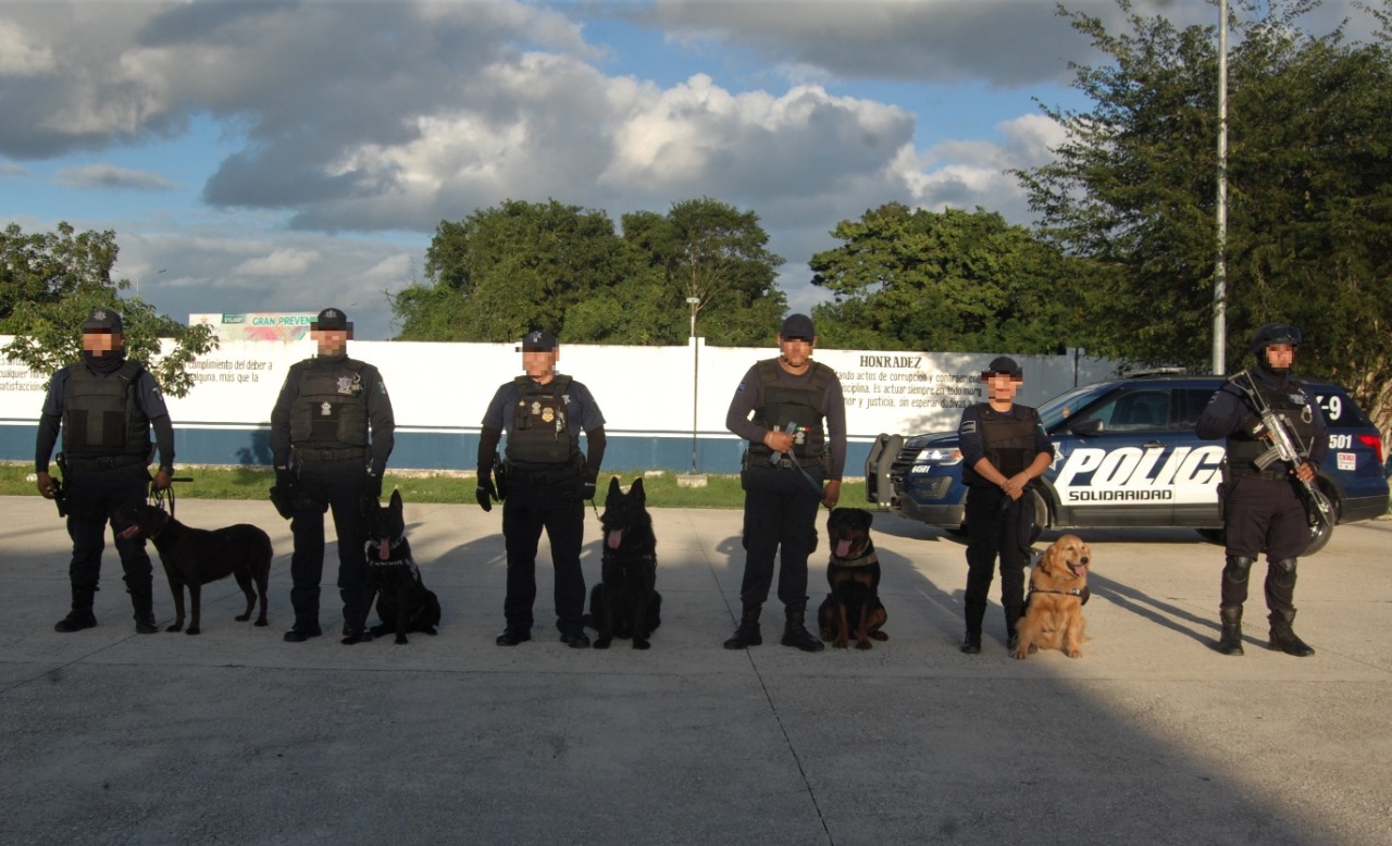 La Unidad Canina de la Policía Municipal de Solidaridad, perteneciente a la Dirección Operativa de la Secretaría Municipal, está conformada por cuatro oficiales caninos de nombre “Kano”, “Roca”, “Mono” y “Martina”, los cuales tienen entrenamiento especializado en la detección de narcóticos, armas de fuego, papel moneda y explosivos.