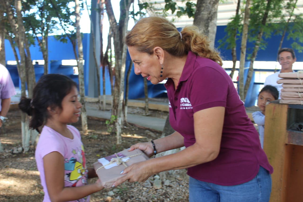 al entregar paquetes de útiles escolares en el fraccionamiento de Villas del Sol, en Solidaridad.