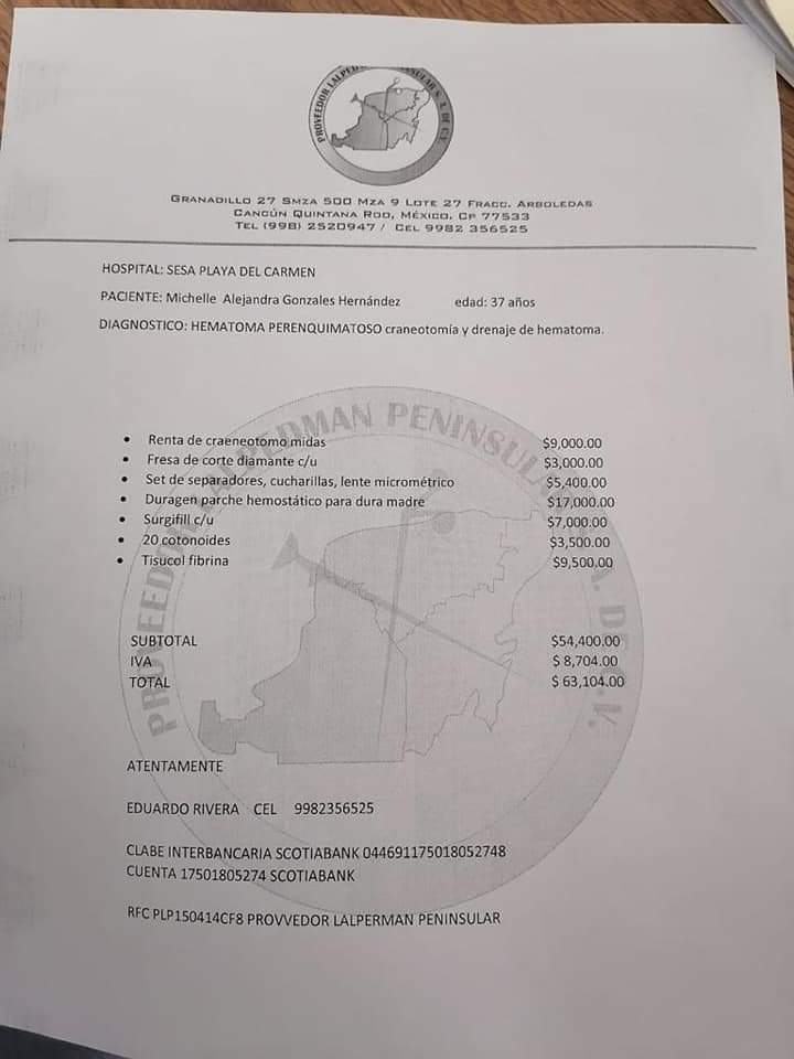 La cuenta es muy elevada y la familia no logra reunirla, son más de 63 mil pesos; por ello, sus familiares están haciendo un llamado a la sociedad quintanarroense, a fin de conseguir el monto que permita pagar el instrumental que, de hecho, ya se utilizó, a Michelle le han salvado la vida y se encuentra en este momento en recuperación en el Hospital General de Playa del Carmen.