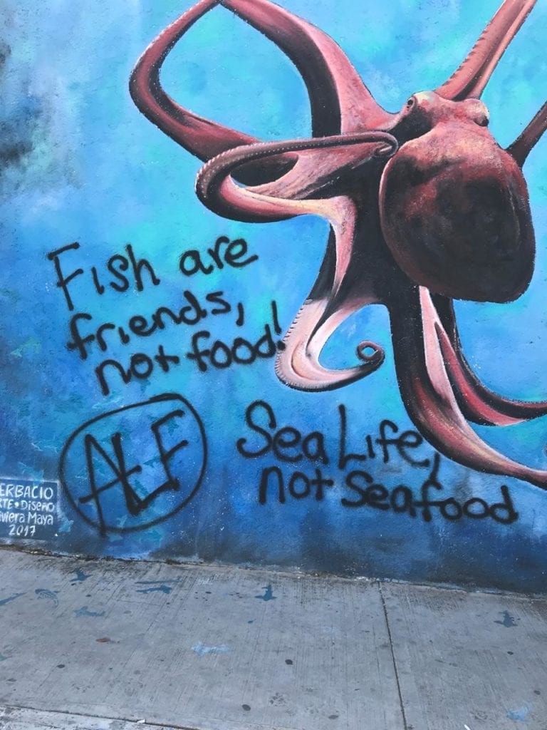 Del otro lado, se lee el texto “fish are friends, not food!” (los peces son amigos, no comida), y “sea life, not seafood” (vida marina, no comida marina).