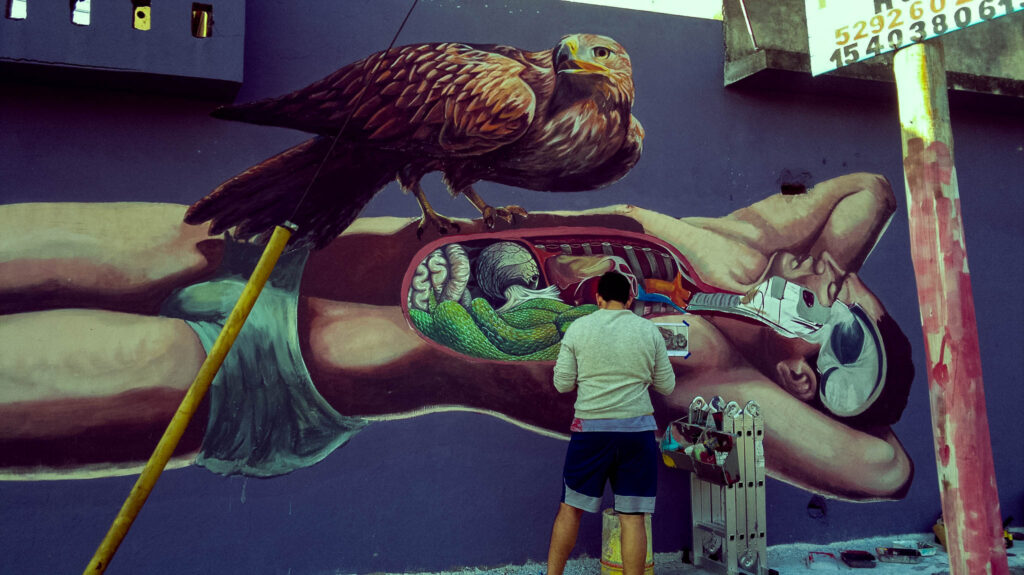 Con Quinta Fuerza platicó este artista plástico y audiovisual, quien explicó que al ir y venir de su país a Playa del Carmen para visitar a su novia, por cuestiones de la pandemia, se quedó en esta ciudad donde además se casó y decidió proseguir con el largo trabajo que llevaba realizando. “Estuve aquí pintando murales, también en medio de la pandemia hice un documental, porque en Argentina doy seminarios de murales y allá tengo alumnos que siempre me preguntan, por eso y porque estudié cine, decidí hacer este documental de cómo autogestionar un mural en un país donde nadie te conoce, cómo crear lazos desde cero, cómo hacer un portafolio, conseguir patrocinios, cómo pasar de un boceto a un mural, etc.”.