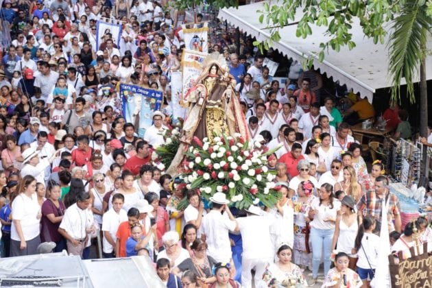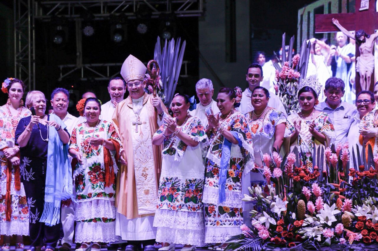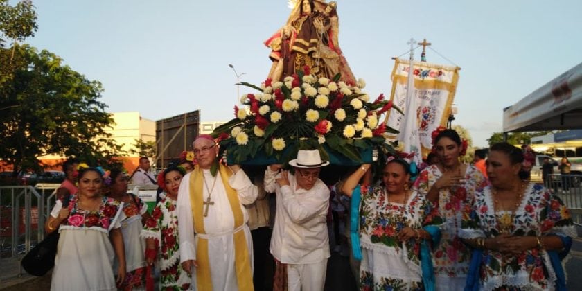 A su regreso, los gremios acompañaron a la Virgen del Carmen hasta el recinto ferial, donde Monseñor Pedro Pablo encabezó la misa y coronó a la Patrona de Playa del Carmen.
