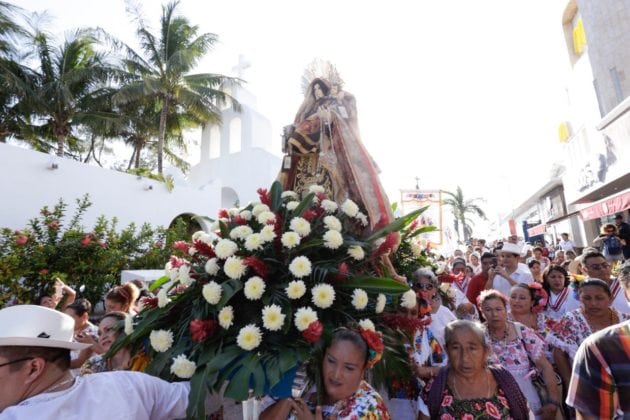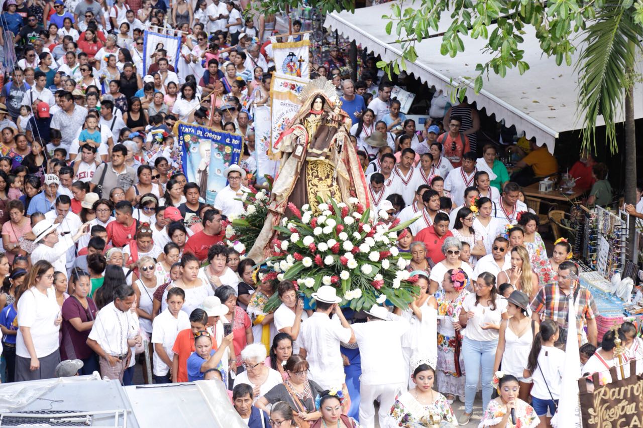 Previó al baile del Cochino en el recinto ferial, se realizó la procesión con la imagen de la Virgen del Carmen, de la Parroquia de Nuestra Señora del Carmen sobre la 5ta Avenida hasta Playa Caribe, punto del cual partió la patrona en una barca en compañía de los hombres del mar, con el fin de ofrendar flores al Caribe Mexicano en agradecimiento.