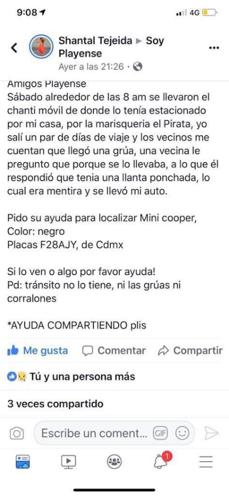 A través del grupo Soy Playense, una usuaria denunció el robo de su automóvil por parte de una grúa, pero que no lo tiene Tránsito, ni las grúas o corralones.