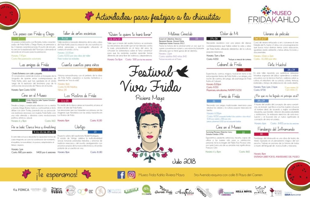 Playa del Carmen, Quintana Roo.-Con una cartelera nutrida y pensada para toda la familia, el Museo Frida Kahlo Riviera Maya, ha iniciado por todo un mes el Festival “Viva Frida”, para que los playenses y visitantes se acerquen a esta artista que gracias a su popularidad, se ha convertido en un emblema de nuestro país.