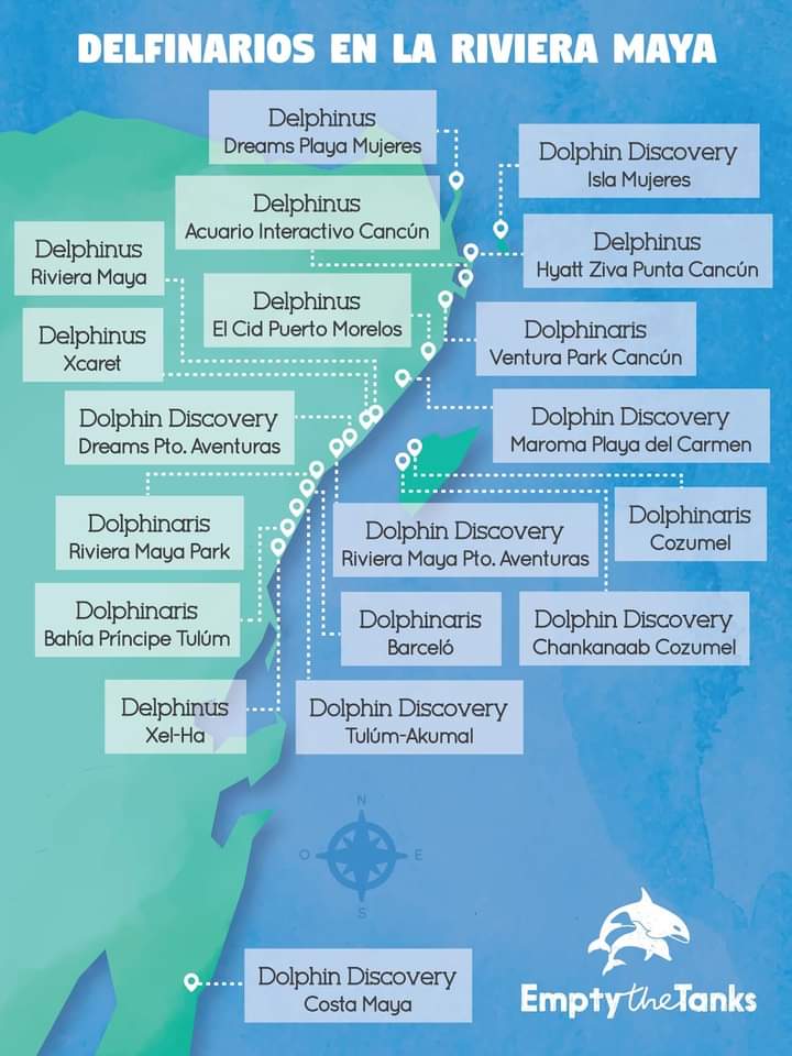 Acompañado de esta opinión se comparte un mapa donde se aprecian los 19 parques que había hasta octubre de 2020 en la Riviera Maya y que tienen delfines en cautiverio.