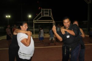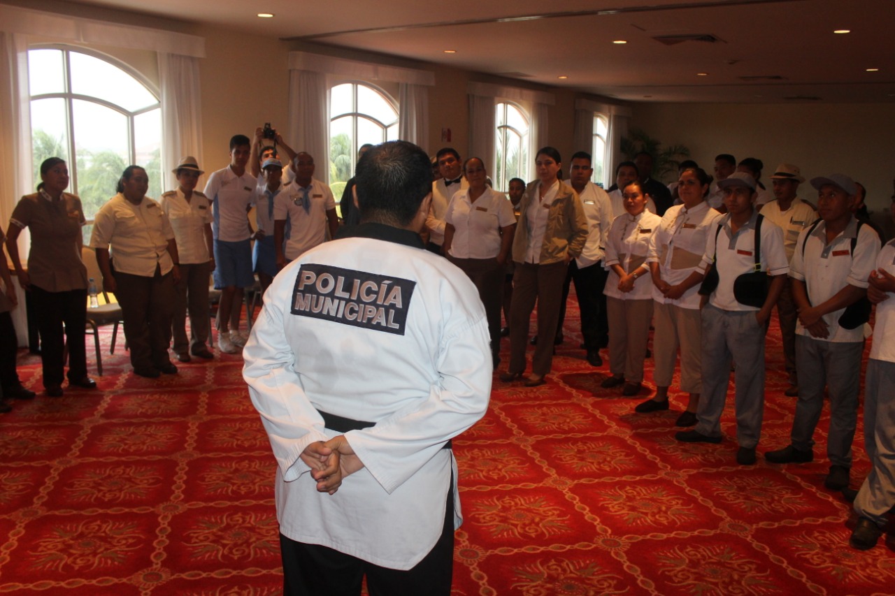 Playa del Carmen.- Elementos de la Dirección General de Seguridad Pública y Tránsito de Solidaridad que encabeza Martín Estrada Sánchez, imparten técnicas de defensa personal a hombres y mujeres de todas las edades, para que puedan enfrentar y prevenir una situación que los ponga en peligro.