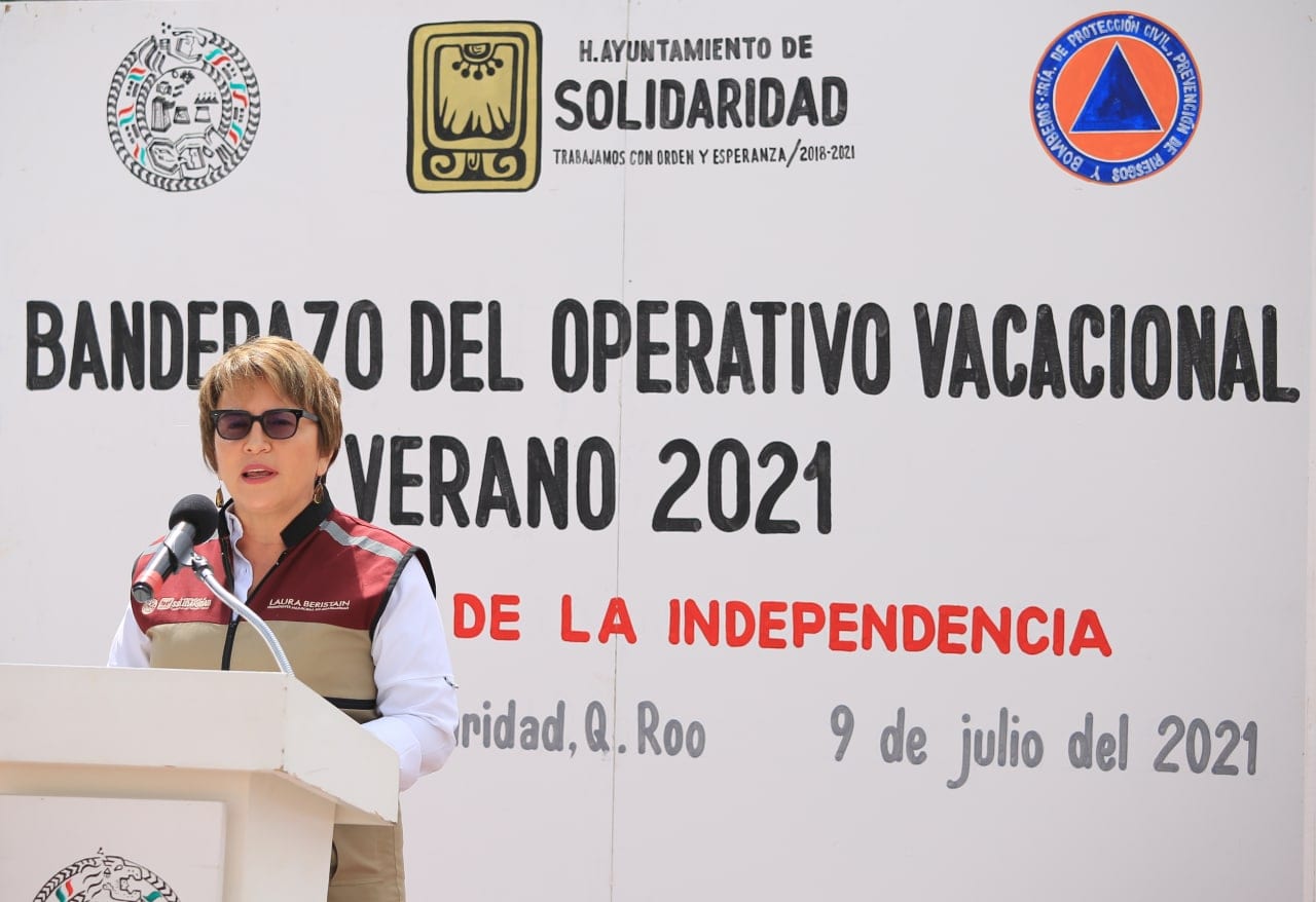 Playa del Carmen, Quintana Roo, a 09 de julio de 2021.- A fin de salvaguardar la seguridad y la salud de turistas y locales en esta temporada, la presidenta municipal Laura Beristain Navarrete dio el banderazo de inicio del Operativo Vacacional “Verano 2021”, a través del cual en conjunto con Ejército, Guardia Nacional, Bomberos, cuerpos de emergencias y Protección Civil se dará puntual atención a la ciudadanía en distintos puntos del municipio.