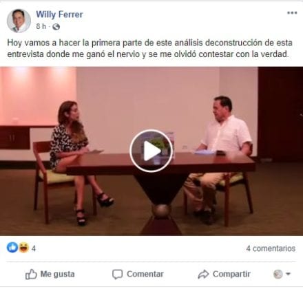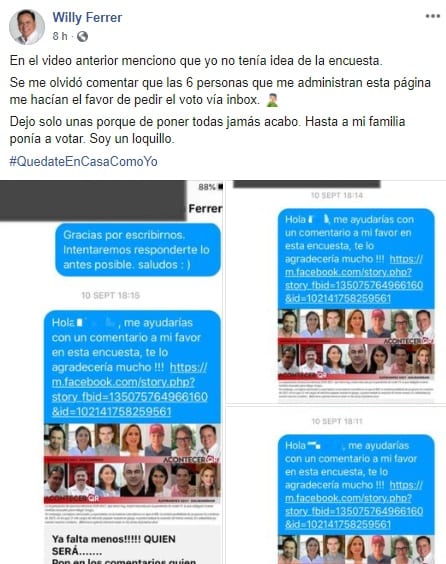 “Mi nombre es Willians Ferrer, Willy Ferrer para los amigos. NO soy empresario, soy ciudadano y vivo de estafar gente”. Ese es uno de múltiples mensajes que aparecen publicados en la cuenta de Facebook de este aspirante a la presidencia municipal de Solidaridad, pues desde hace dos días, personas desconocidas se han apropiado de la misma, acusando al político originario de Tabasco de no pagarles el trabajo realizado.