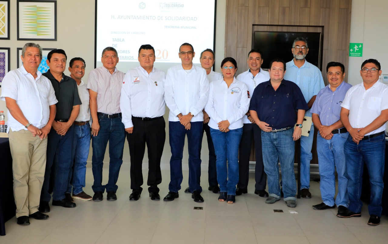 Playa del Carmen.- Con motivo de dar a conocer al sector inmobiliario o vinculado a la transacción de bienes inmuebles, el Proyecto de Tabla de Valores Unitarios 2020, se llevó a cabo una mesa de trabajo encabezada por el secretario general del Ayuntamiento, Alfredo Paz Cetina, como representante de la presidenta municipal Laura Beristain Navarrete y el director de Catastro de Solidaridad, Rafael Adrián Topete Romero, quien presentó esta propuesta donde se prevé la actualización de los avalúos a las propiedades, de acuerdo a los diversos factores que cambian el valor real de una propiedad.