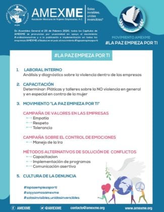 También explicó que el trabajo de la asociación no se quedará en una resistencia pasiva conformada por el movimiento #UnDíaSinNosotras, que también es muy importante, sino que además se propuso y se aceptó en la reciente Asamblea Nacional una participación completa contra la violencia de género. “Haremos un movimiento que incluirá a todas las empresas AMEXME afiliadas en el país y se llama “La Paz Empieza Por Ti”, que consta de puntos como: Laboral interno, para diagnosticar la violencia en los hogares, ya que nuestra casa es nuestra empresa y debemos interesarnos en cómo viven nuestras empleadas. El segundo punto se encauzará de acuerdo con el diagnóstico y es Capacitación para todo el personal, con talleres sobre la no violencia contra la mujer. Además trabajaremos en el impulso de valores como empatía, respeto y tolerancia, que consideramos fundamentales para erradicar la violencia de género, con diversas capacitaciones y estrategias”.