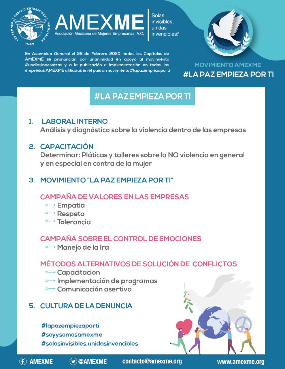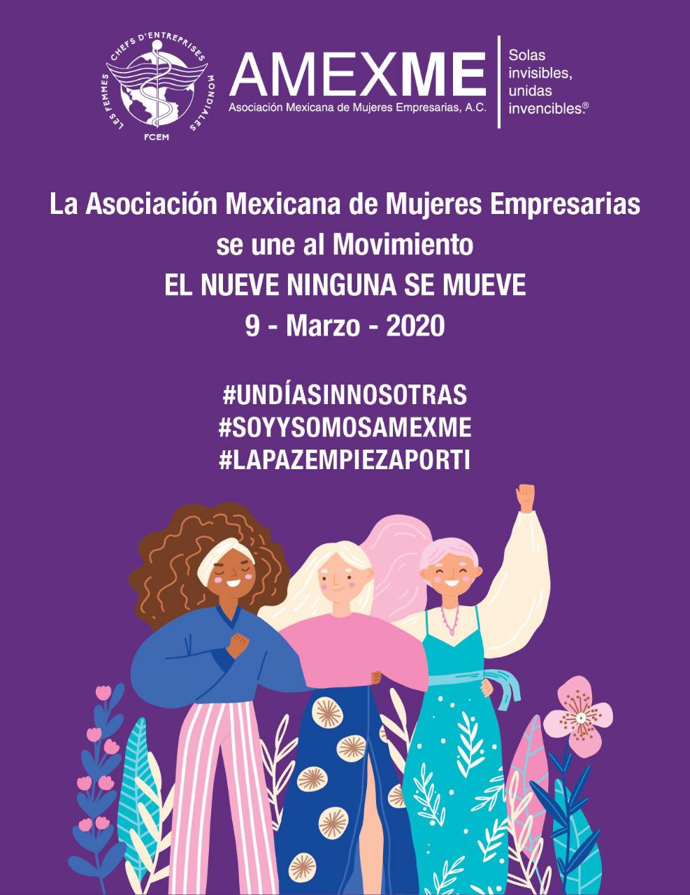 La Asociación Mexicana de Mujeres Empresarias (AMEXME), dio a conocer su posicionamiento ante la actual violencia que viven las mujeres en el país, además de informar cuáles serán sus estrategias para sumarse al combate contra los abusos cometidos hacia muchas ciudadanas. Además, informó que se sumará a la campaña propuesta por la colectividad femenina #UnDíaSinNosotras y sus empresas asociadas serán parte de un movimiento proactivo nacional denominado “La Paz Empieza Por Ti”.