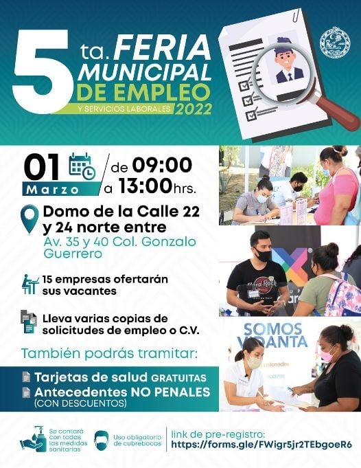 Playa del Carmen, Q. Roo.- El día 1 de marzo se llevará a cabo la Quinta Feria Municipal del Empleo, en el domo de la calle 22 y 24 norte entre avenida 35 y 40 colonia Gonzalo Guerrero.