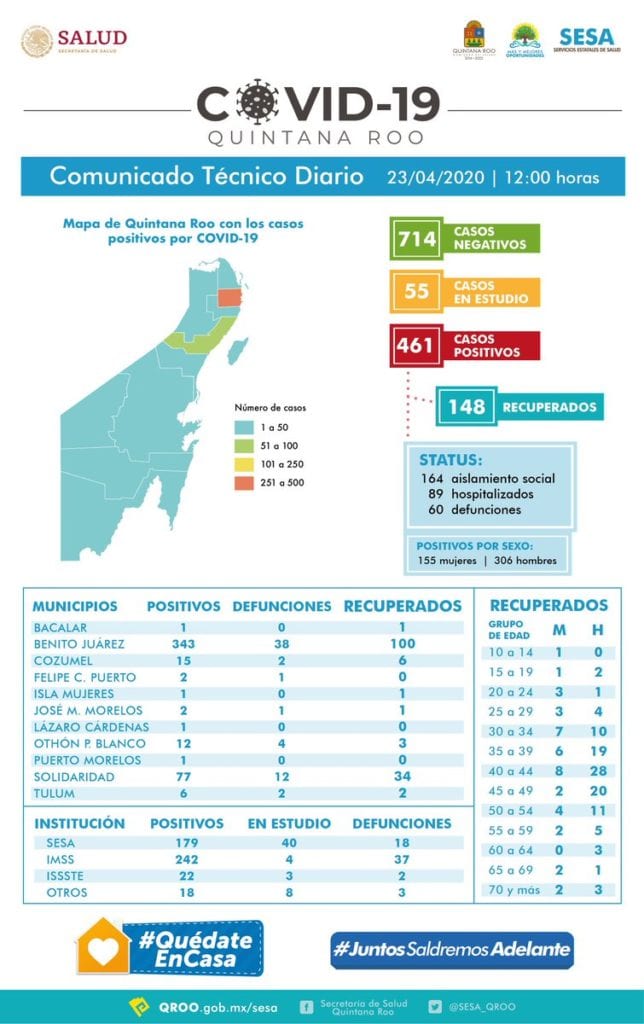 Cabe recordar que la secretaria de Salud, Alejandra Aguirre informó que en las últimas 24 horas, el estado ha sumado cinco víctimas más al saldo mortal por el coronavirus COVID-19, que así llega a 60 casos, cuatro de Benito Juárez y uno de Othón P. Blanco. La cifra total de casos confirmados es de 461, lo que son 35 pacientes más que ayer.