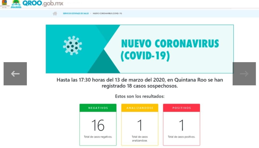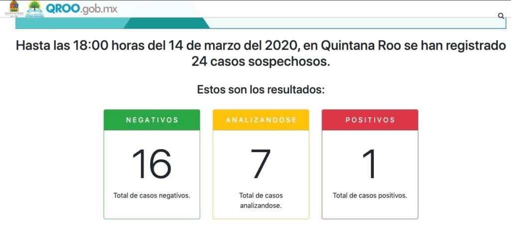 De acuerdo con el corte que ha hecho la Secretaría de Salud de Quintana Roo a las 18:00 horas de este sábado 14 de marzo de 2020, la entidad continúa con un solo caso confirmado de coronavirus o Covid-19.