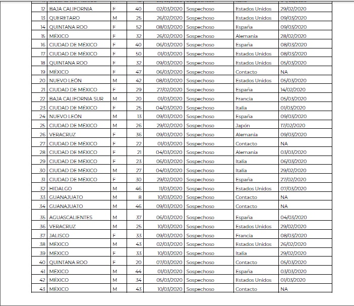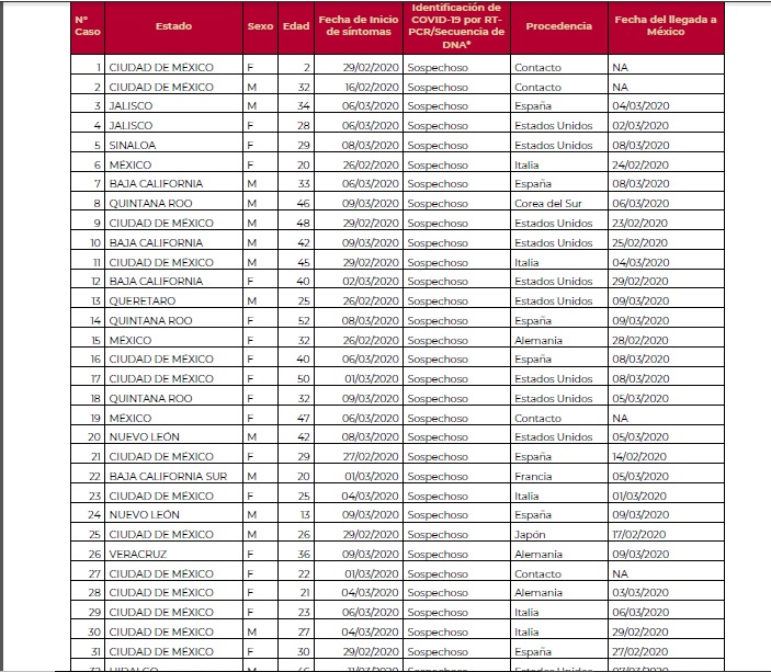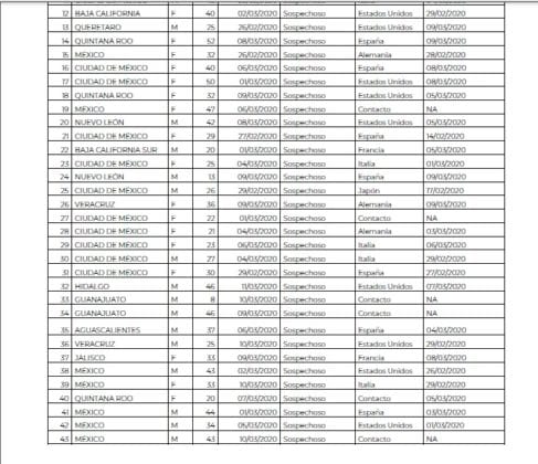 A través de una tabla proporcionada por el gobierno Federal, se indicó que de los 16 casos sospechosos, tres casos sospechosos se detectaron el día de hoy, un masculino de 46 años a quien los síntomas le iniciaron el 9 de marzo que estuvo en Corea del Sur en días pasados; mismo caso de una fémina con fecha similar, de 32 años que viene regresando de España; y finalmente una mujer de 52 años que inició con los síntomas el 8 de marzo y que proviene de Estados Unidos.