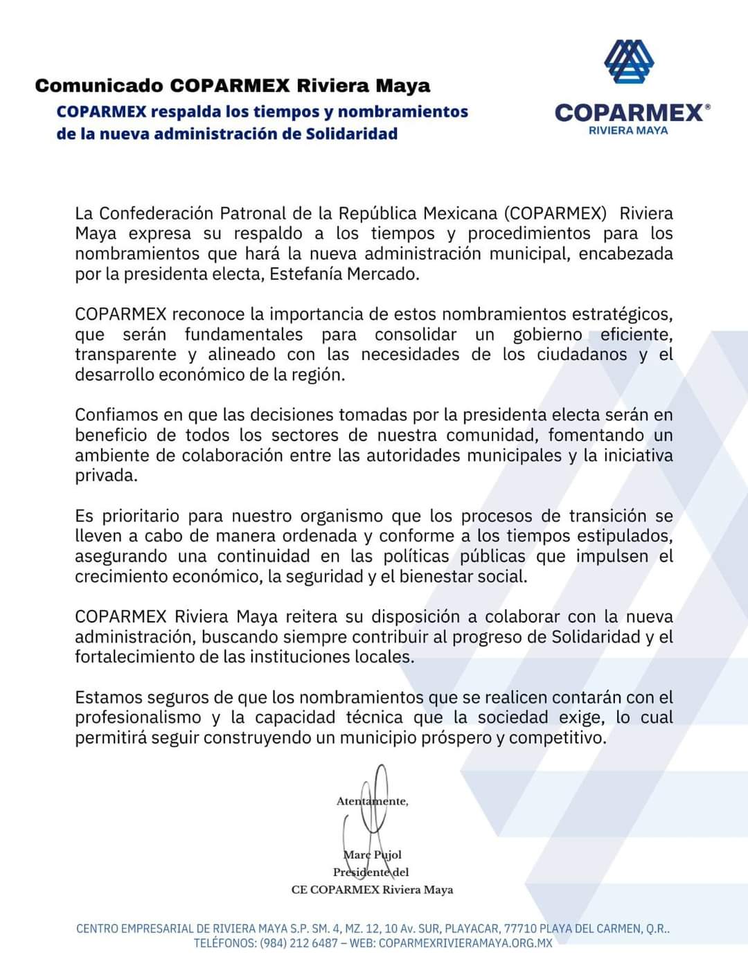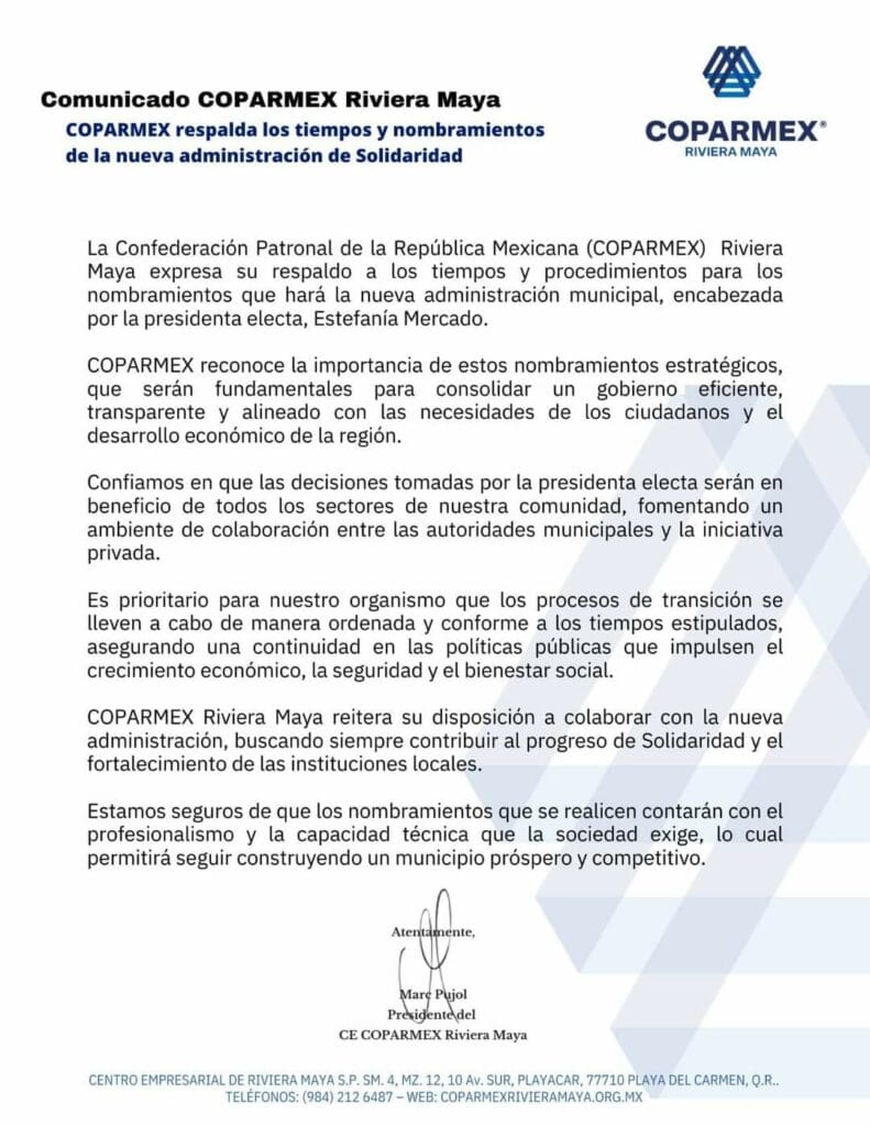 “La Coparmex Riviera Maya expresa su respaldo a los tiempos y procedimientos para los nombramientos que hará la nueva administración municipal, encabezada por la presidenta electa, Estefanía Mercado“, detalla el organismo por medio de un comunicado.