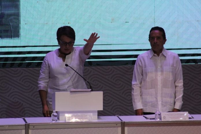 Playa del Carmen,Quintana Roo.- “No desistiré de revocar la concesión de Aguakan”, aseguró Laura Beristain Navarrete, después de rendir protesta como presidenta municipal de Solidaridad en el Teatro de la Ciudad, ceremonia que la regidora Samaria Angulo Sala intentó abandonar abruptamente, al ser excluida del pase de lista.