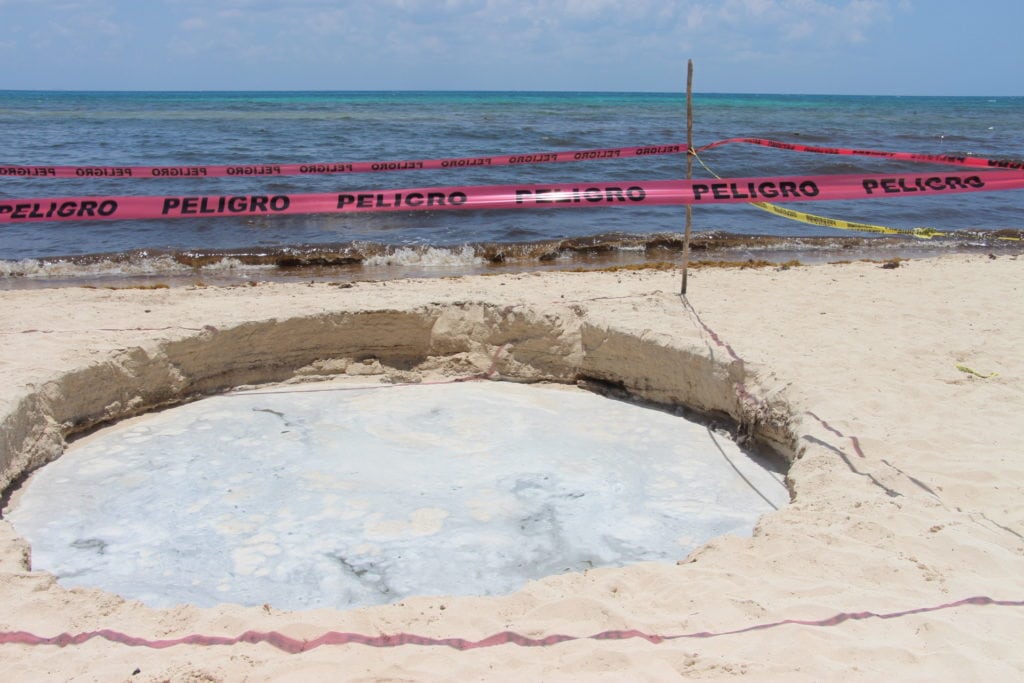 Playa del Carmen, Quintana Roo.-Durante la madrugada de este día, trabajadores de los hoteles que se ubican en la franja de la Zona Federal Marítimo Terrestre (ZOFEMAT), dieron aviso a las autoridades de la presencia de un ‘ojo de agua’ que presumieron, se trataba de un nuevo cenote o un socavón en Playa del Carmen.
