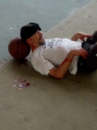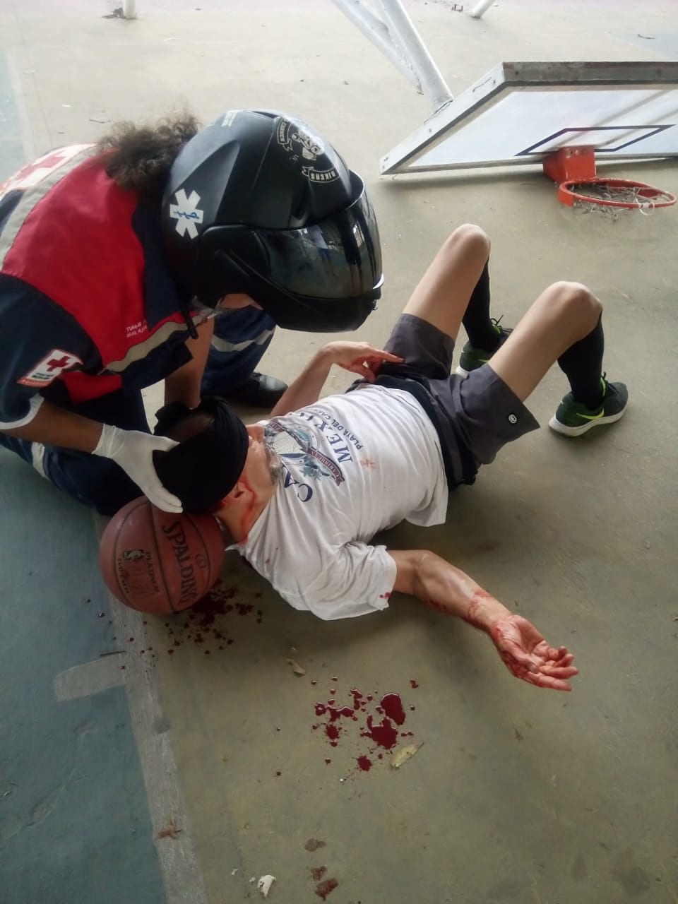 La canasta provocó una herida en su cabeza, por lo que su hijo, una persona mayor de edad lo recostó en el suelo en espera de que la ambulancia arribará a dar auxilio.