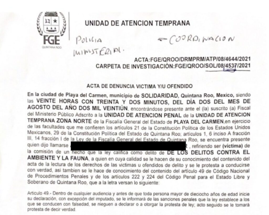 El 2 de agosto de este año, más de un mes antes del envenenamiento de Maya y Rex, David Robinson fue denunciado ante la Fiscalía General del Estado de Quintana Roo por delitos contra el ambiente y la fauna.