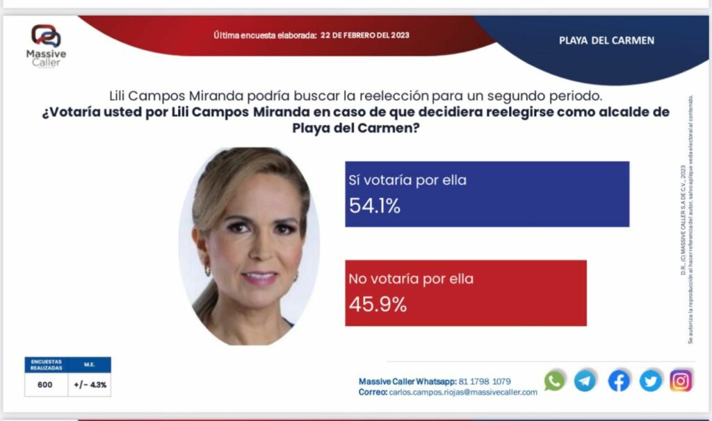 Playa del Carmen.- Según la última encuesta elaborada por Massive Caller para medir la intención del voto para la alcaldía de Playa del Carmen, el 54.1 de los solidarenses votaría por Lili Campos, actual presidenta municipal de Solidaridad; en caso de que buscara la reelección para un segundo periodo de mandato.