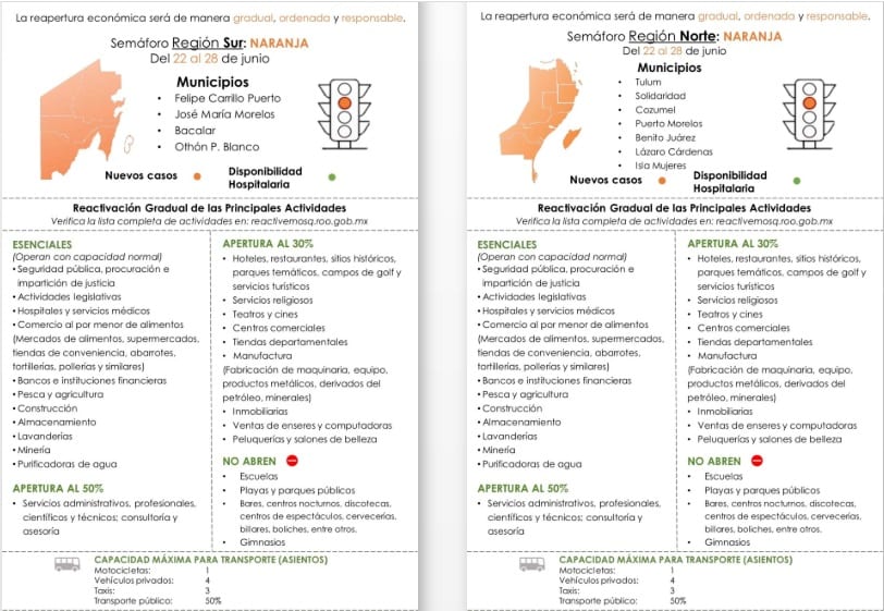 Toda esta semana, la zona norte (compuesta por los municipos de Isla Mujeres, Lázaro Cárdenas, Benito Juárez, Puerto Morelos, Solidaridad Cozumel y Tulum) se ha mantenido en nivel naranja, mismo que no ha sido modificado; en tanto que la zona sur (Othón P. Blanco, Bacalar, Felipe Carrillo Puerto y José María Morelos) ha estado en nivel rojo (solo actividades esenciales).