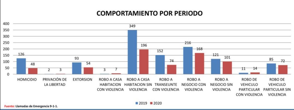 Las nuevas estrategias coordinadas entre los tres órdenes de gobierno, brindan resultados positivos; en el periodo que comprende del 1 de enero al 13 de julio de 2020, en comparación con el mismo periodo del 2019, se ha logrado reducir 62% el delito de homicidio, 42% el delito de extorsión, 43.9% el robo a casa habitación sin violencia, 51.4% el robo a transeúnte, 22.3% el robo a negocios con violencia, 15.3% el robo de vehículo particular sin violencia, según estadísticas de la Secretaría de Seguridad Pública del Estado de Quintana Roo.