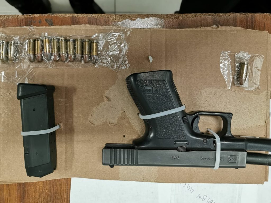 Ante los hechos, los policías procedieron a realizarle una inspección de seguridad a la que accedió de conformidad, encontrando en un compartimento ubicado en medio de los dos asientos delanteros, un arma corta color negro, un cargador con 9 cartuchos .9 mm y 2 cartuchos de .9 mm.