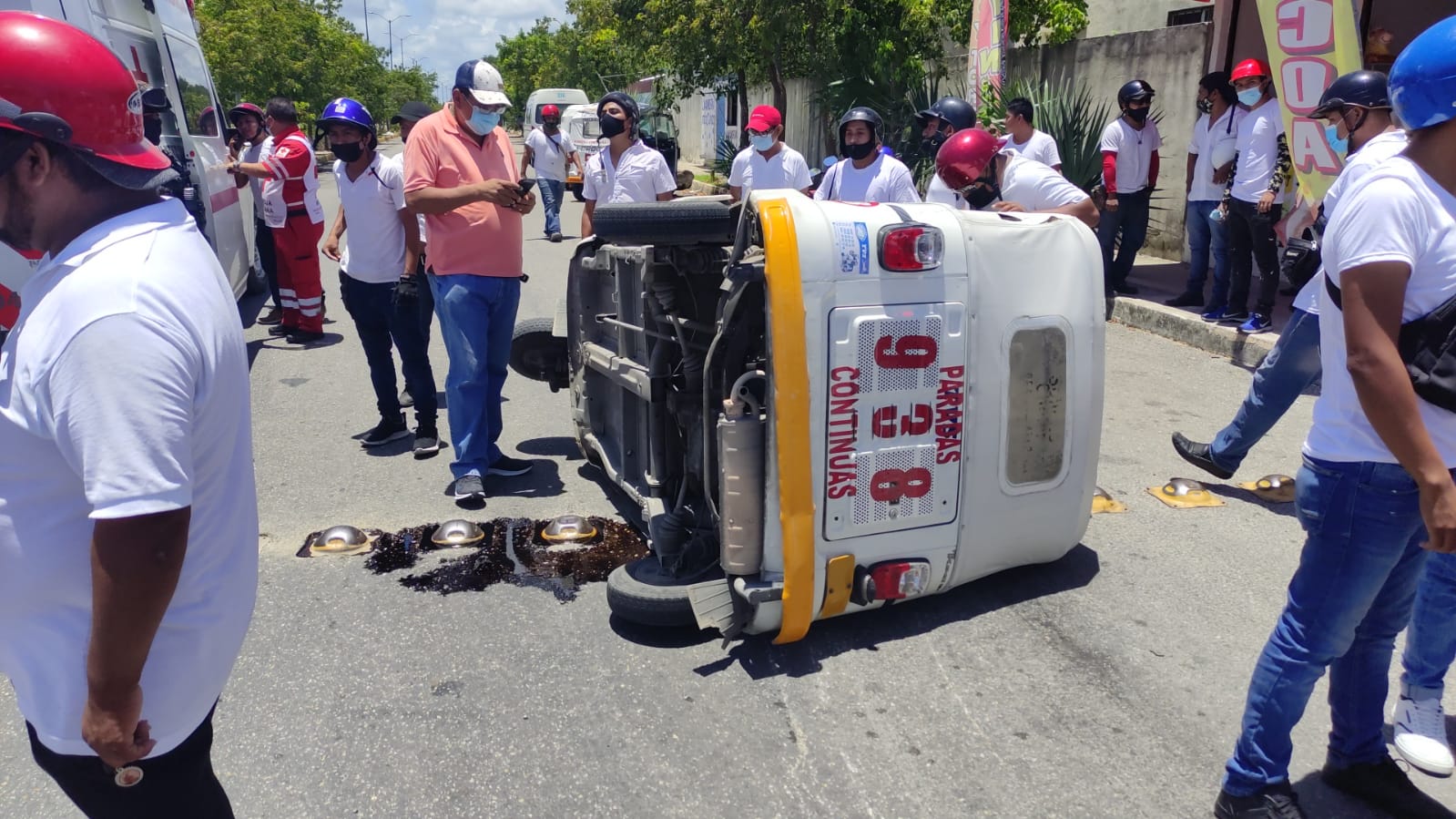 De acuerdo con testigos, el operador de la unidad 2421 se pasó el alto en el cruce de Cigüeñas e impactó a un mototaxi marcado con el número 938, originando que este último quedara recostado sobre la vialidad.