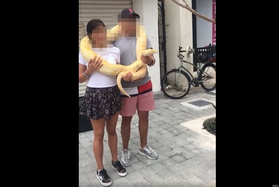 En redes sociales, la organización Activistasqrock exhibió a este sujeto que retrata a paseantes con un ejemplar de pitón. “En plena Quinta Avenida con calle 4 y 6 de Playa del Carmen este hombre ofreciendo fotos con esta serpiente de pitón”, publicó junto a su video el organismo.