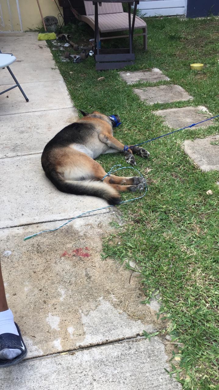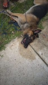El pastor alemán murió estrangulado con un mecate por dos hombres en una casa en el fraccionamiento Villas del Sol Plus, esta tarde, lo que generó el enojo de vecinos, quienes los reportaron a la policía.