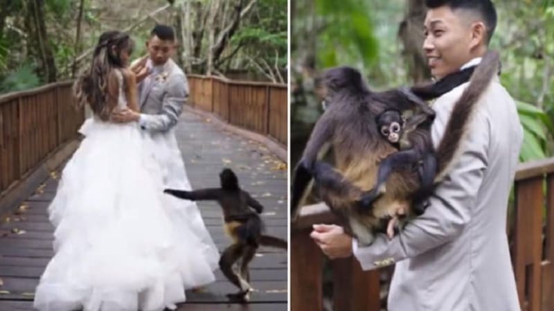 La novia Sophie U. Ngo no pudo evitar espantarse y gritar por la repentina aparición del mono araña que inmediatamente trepó hacia los brazos del novio Andrew Huynh, quien tomó la situación con calma y gran alegría.