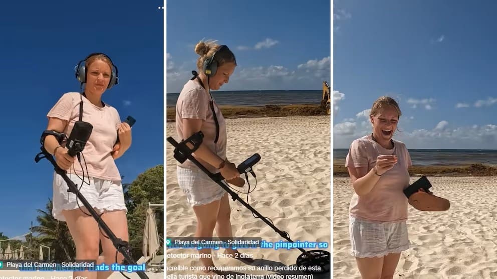 Las imágenes muestran a la turista con una mezcla de emoción y alivio, sosteniendo su anillo de compromiso tras recuperarlo con ayuda del aparato conocido como pinpointer, un dispositivo más preciso que se usa para localizar objetos metálicos enterrados.