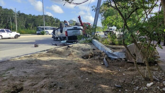Vuelca camioneta de lujo en la salida sur de Playa del Carmen