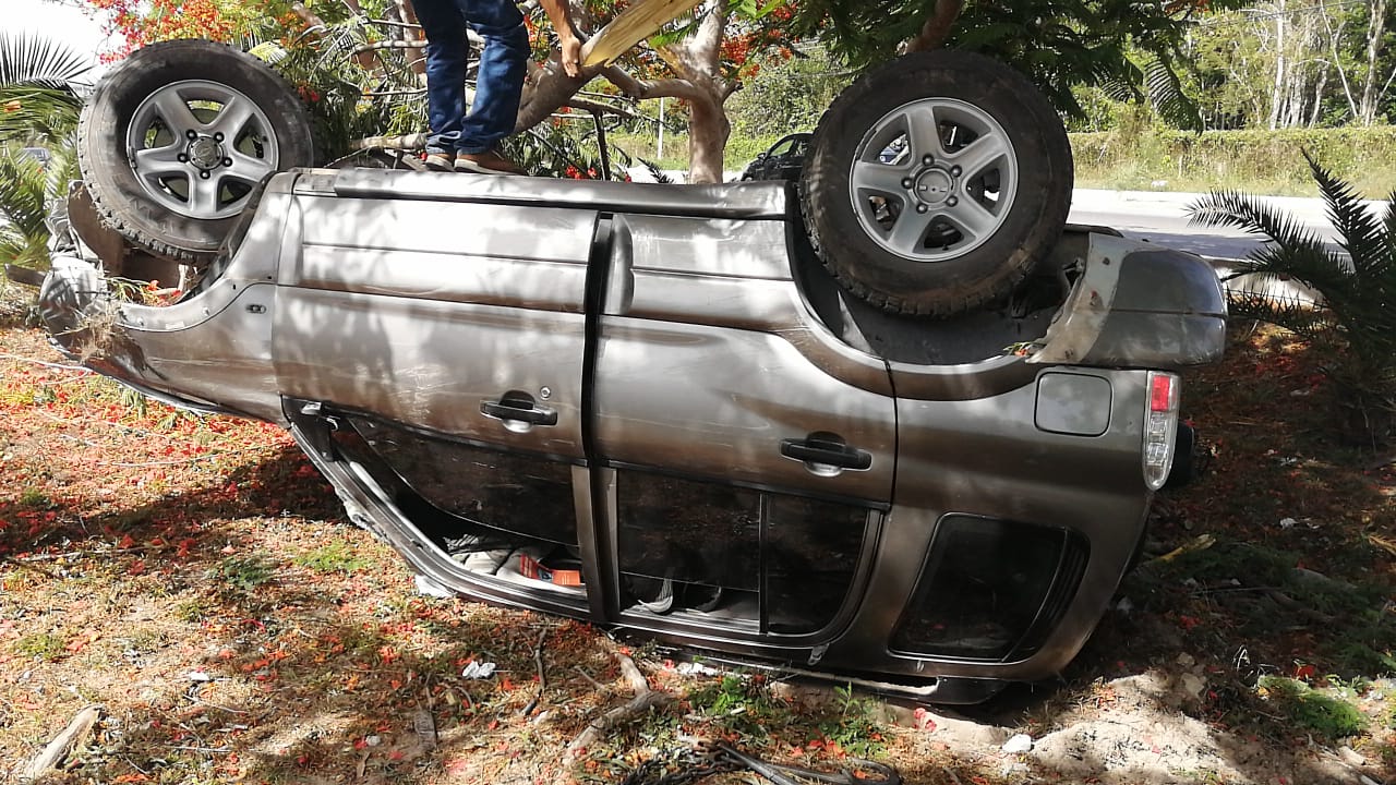 Playa del Carmen.- Un vehículo acabó volcado junto a la carretera federal 307, en su tramo Puerto Morelos-Playa del Carmen, a corta distancia del filtro policiaco de entrada a esta ciudad.