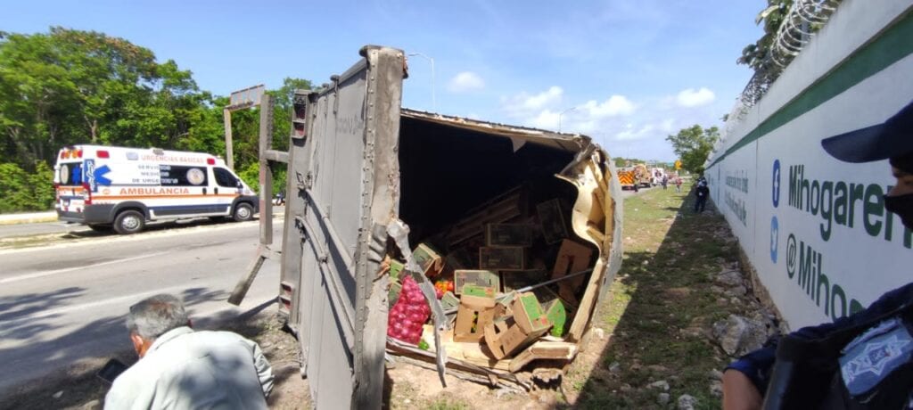 Playa del Carmen.- Un tráiler que iba cargado de frutas y verduras se volcó cuando iba en dirección al poniente sobre la prolongación de la avenida Colosio, a corta distancia de transformarse en la carretera de paga a El Tintal.
