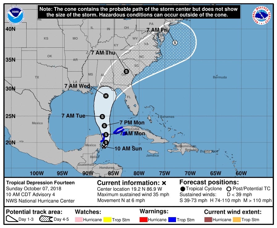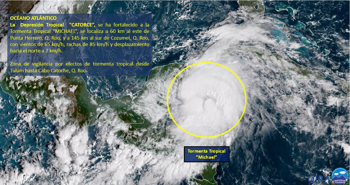 Por el momento “Michael” se ubica a 145 kilómetros al sur de la isla de Cozumel, con vientos de 64 km/hr; se desplaza a una velocidad de ocho kilómetros por hora.
