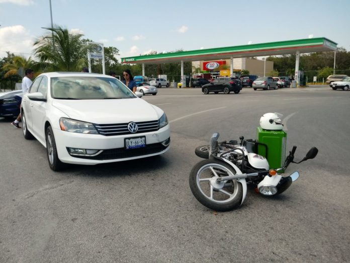 Playa del Carmen.- Esta tarde una distraída conductora atropelló a un motociclista luego de no cederle el paso, pues estaba tomándose una “selfie” mientras conducía, por lo que el sujeto terminó en el suelo con todo y la comida que tenía que entregar.
