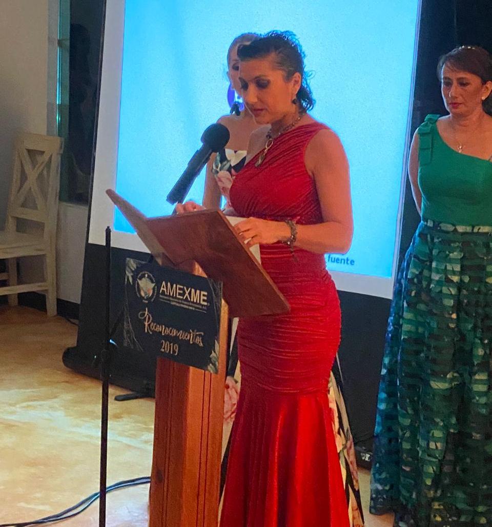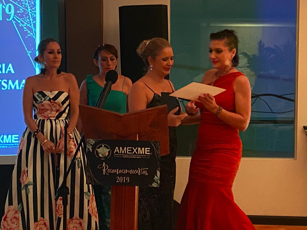 Al recibir su premio como Empresaria del Año, Valeria Rindertsma, propietaria de Casa Kaoba, agradeció entre lágrimas a la Adriana Bravo, ex dirigente de Amexme, por haber servido de guía y de ayuda en este año tumultuoso.