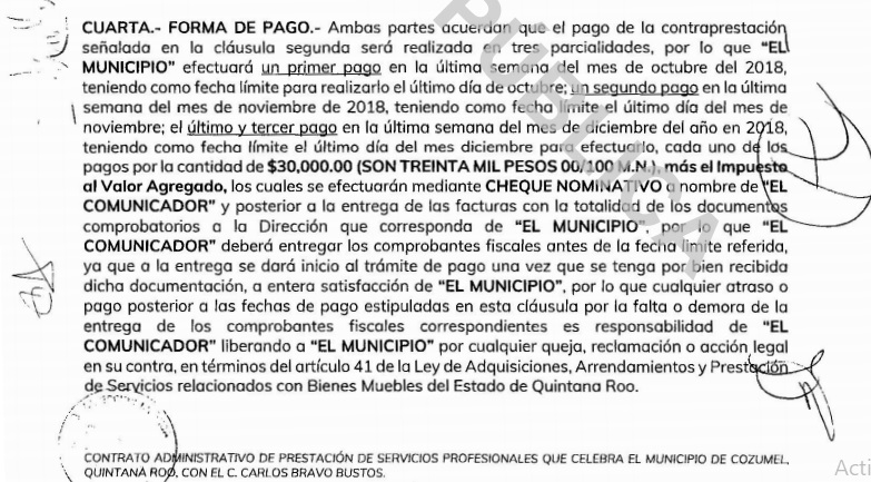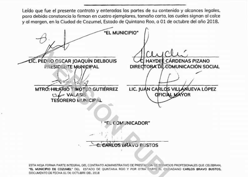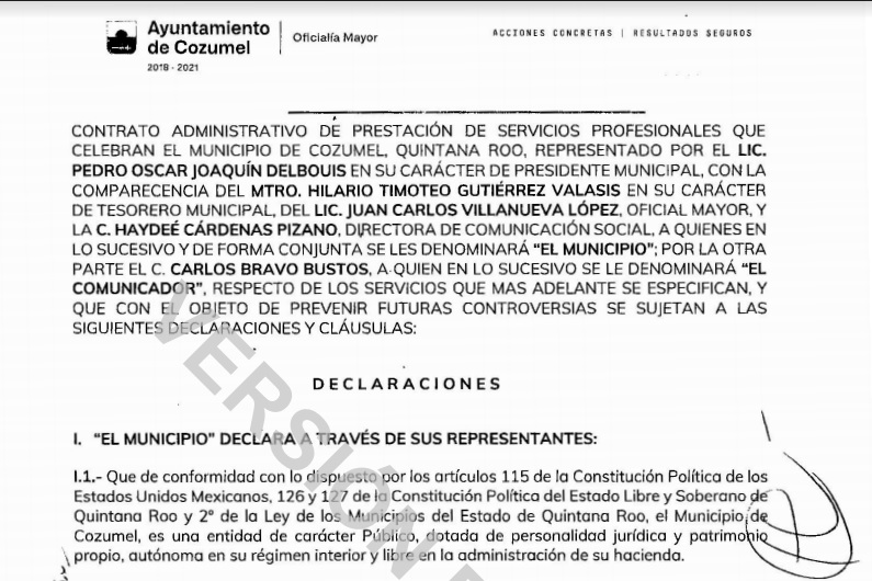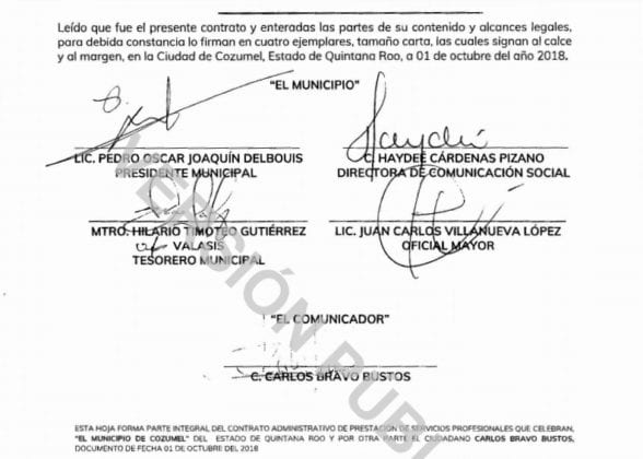 El contrato indica que el monitoreo de las principales redes sociales en Cozumel se hará de forma diaria y “el comunicador” se compromete a entregar las evidencias y comprobables de ello.