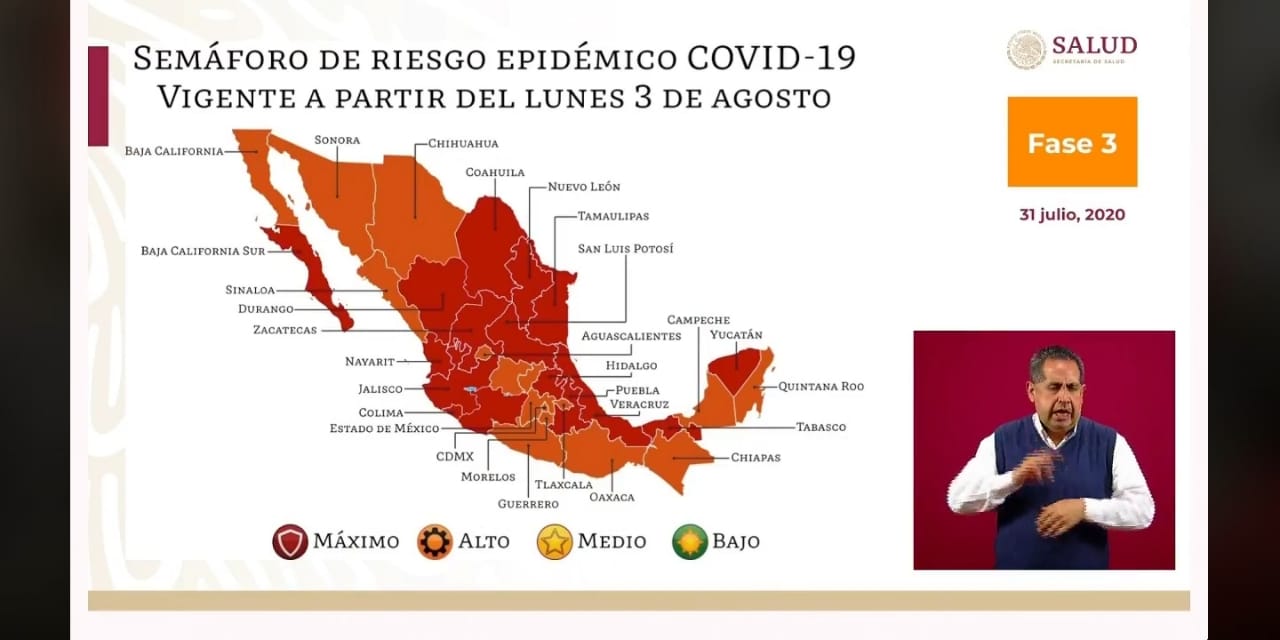 Puebla, Puebla.- El subsecretario de Prevención y Promoción de la Salud, Hugo López Gatell, presentó el Semáforo de Riesgo Epidémico Federal que tendrá vigencia desde el próximo lunes, donde Quintana Roo aparece en color naranja y la Ciudad de México, que tanto temía retroceder por el alto número de contagios, permanece en color naranja.
