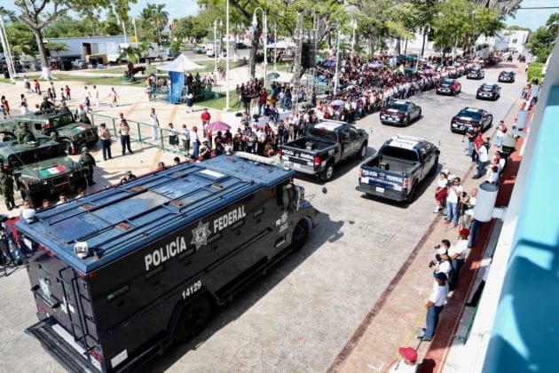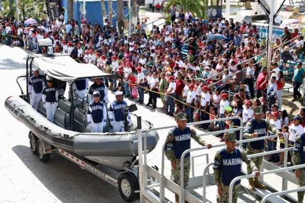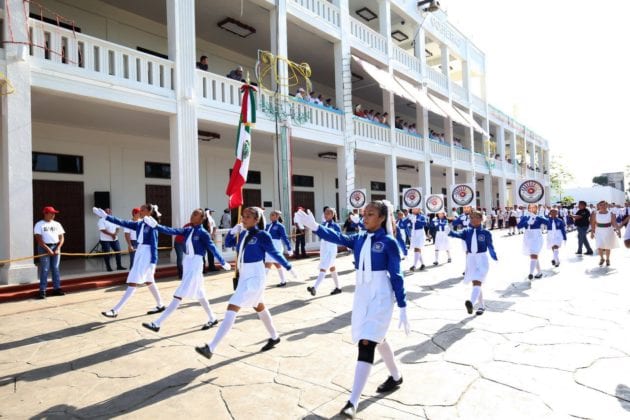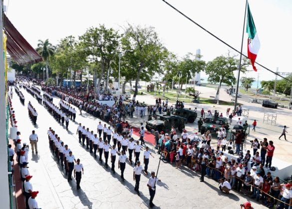 Chetumal.– En el marco de las Fiestas Patrias 2019 que se realizan en Quintana Roo para conmemorar el 209 aniversario de la lucha de la Independencia, el gobernador Carlos Joaquín presidió el Desfile Cívico Militar desde Palacio de Gobierno en compañía de familias quintanarroenses.