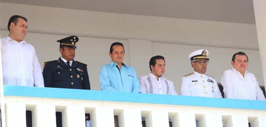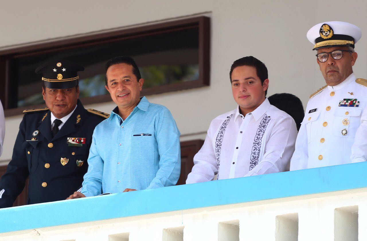 En el balcón principal, el gobernador estuvo acompañado por el magistrado del Tribunal Superior de Justicia José Antonio León Ruiz; Edgar Gasca Arceo, de la Junta de Gobierno y Coordinación Política del Congreso del Estado; el comandante de la 34 Zona Militar Miguel Ángel Huerta Ceballos; el vicealmirante Eduardo Rojas Pineda, comandante de la XI Zona Naval; el inspector Juan Manuel Ayala Guarro, comisionado de la Policía Federal de Quintana Roo; María del Socorro Alatriste Mujer Independencia 2019.