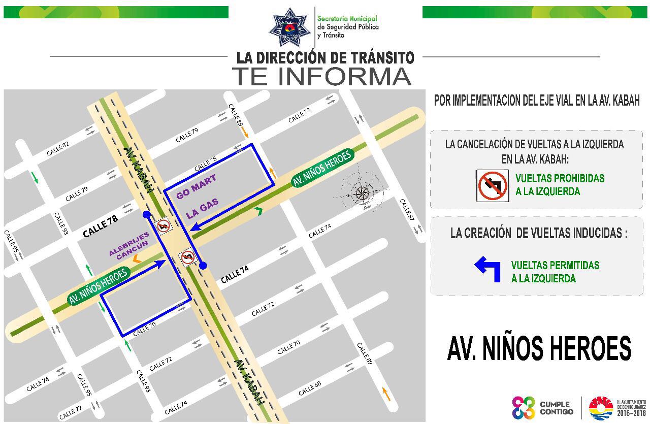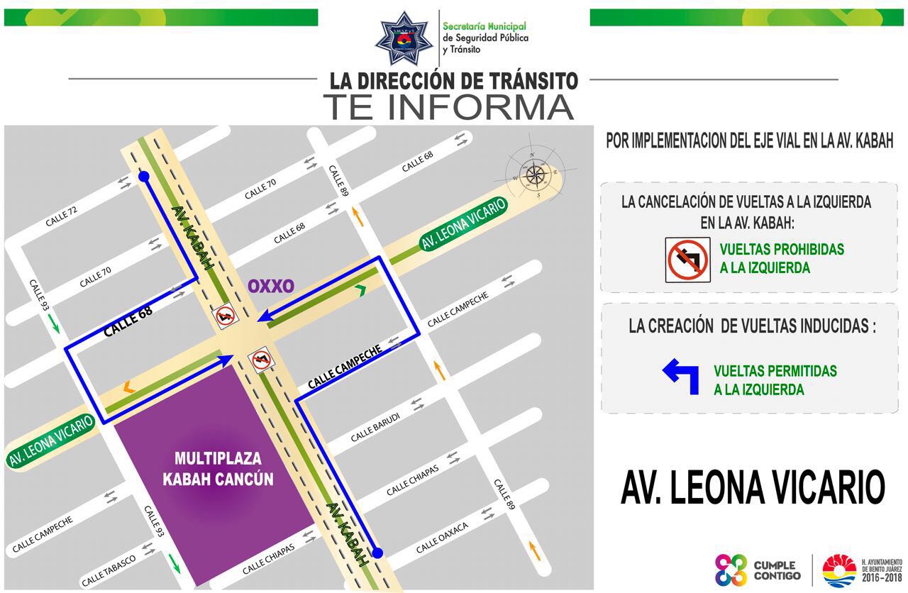 Cancún.- El Ayuntamiento de Benito Juárez continúa cerrando las vueltas a la izquierda sobre la avenida Kabah, y a partir de mañana no se podrá hacer esta maniobra en los cruces con las avenidas Leona Vicario y Niños Héroes.