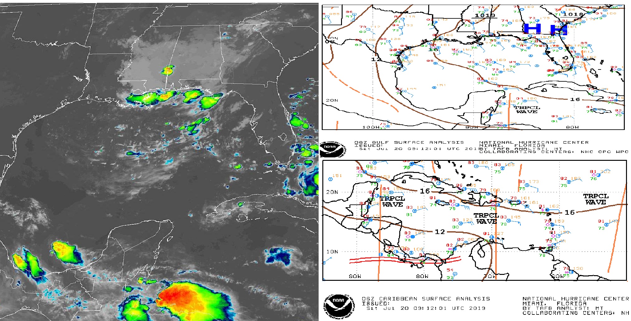 Además con base a la valoración y análisis de la información meteorológica en general realizada y lo relativo a los pronósticos del Servicio Meteorológico Nacional, la Onda Tropical No. 19 localizada en superficie sobre el mar Caribe ubicado frente a las costas de Quintana Roo, se mueve al oeste, lo que provocara temperaturas muy calurosas, nubosidad con lluvias con chubascos acompañado de actividad eléctrica, sobre la región Peninsular y principalmente en zona sur del Estado de Quintana Roo.