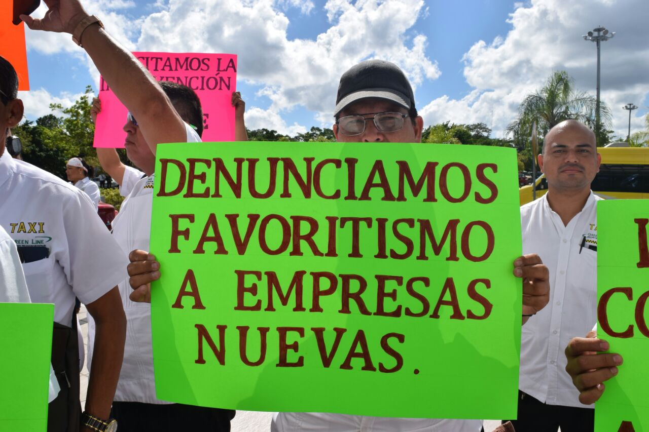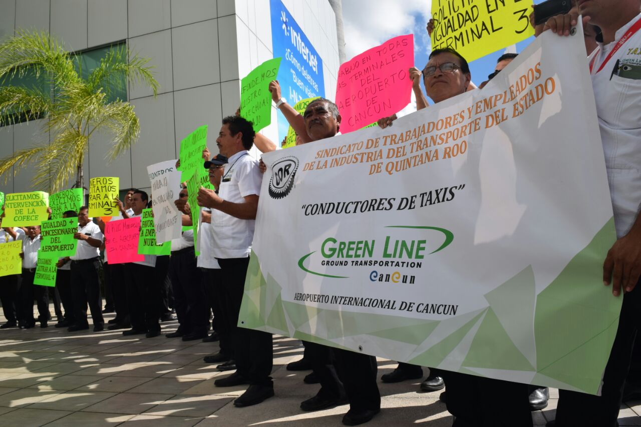 Cancún.- Cerca de medio centenar de operadores de la empresa “Green Line”, propiedad del Sindicato de Taxistas “Andrés Quintana Roo”, se manifestó hoy al mediodía en las oficinas de Asur, en el Aeropuerto Internacional de Cancún, para exigir que les dejen laborar en las terminales 3 y 4, ya que la empresa parece favorecer a otros transportistas.