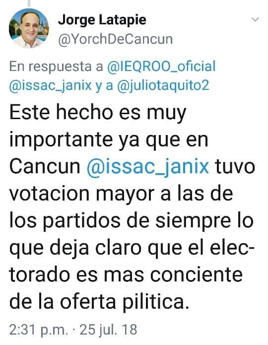 Al respecto, Jorge Latapie (@YorchDeCancun) destaca que “este hecho es muy importante ya que en Cancún Issac Janix tuvo votación mayor a la de los partidos de siempre, lo que deja claro que ele electorado es más consciente de la oferta política”.