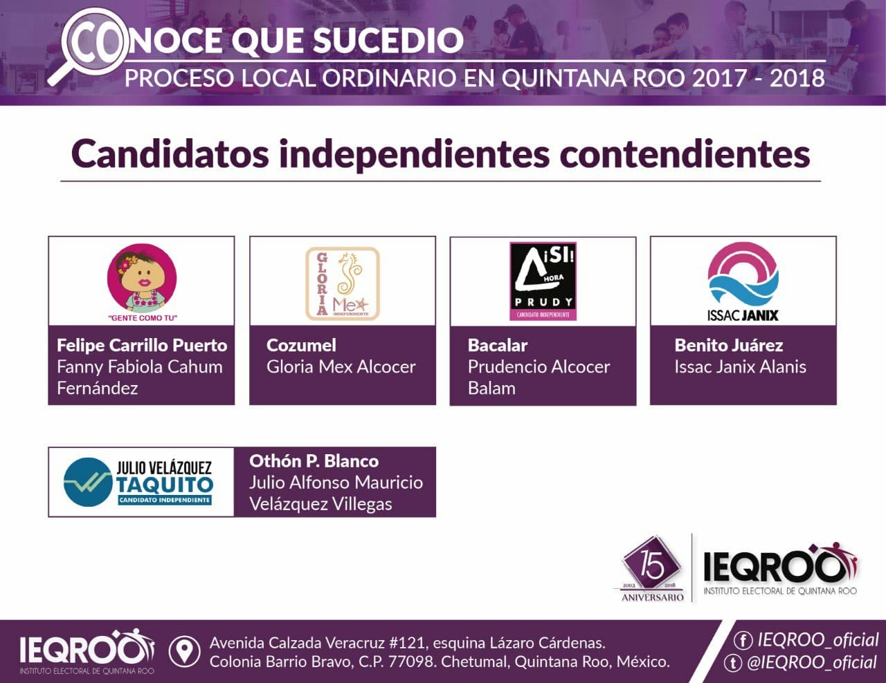 Chetumal.- El Instituto Electoral de Quintana Roo (Ieqroo) destacó la “participación de cinco candidatos/as independientes, dos de ellos, por primera vez en la historia política del Estado, tendrán representación en los cabildos municipales: Issac Janix (Cancún) y Julio Velázquez (Othón P. Blanco)”.